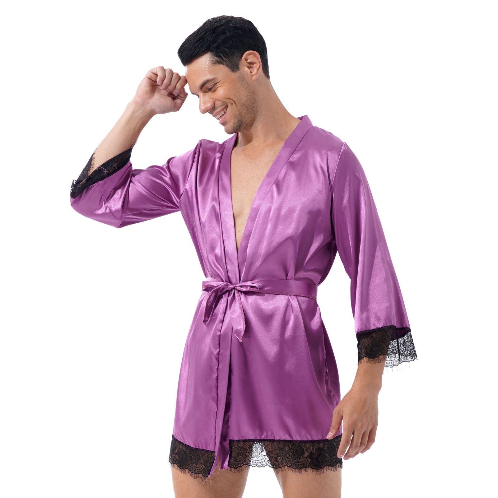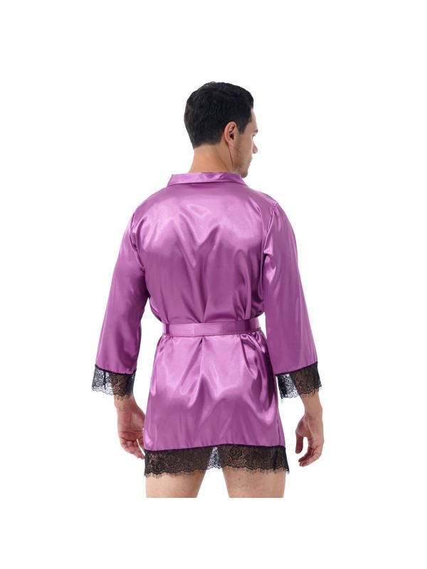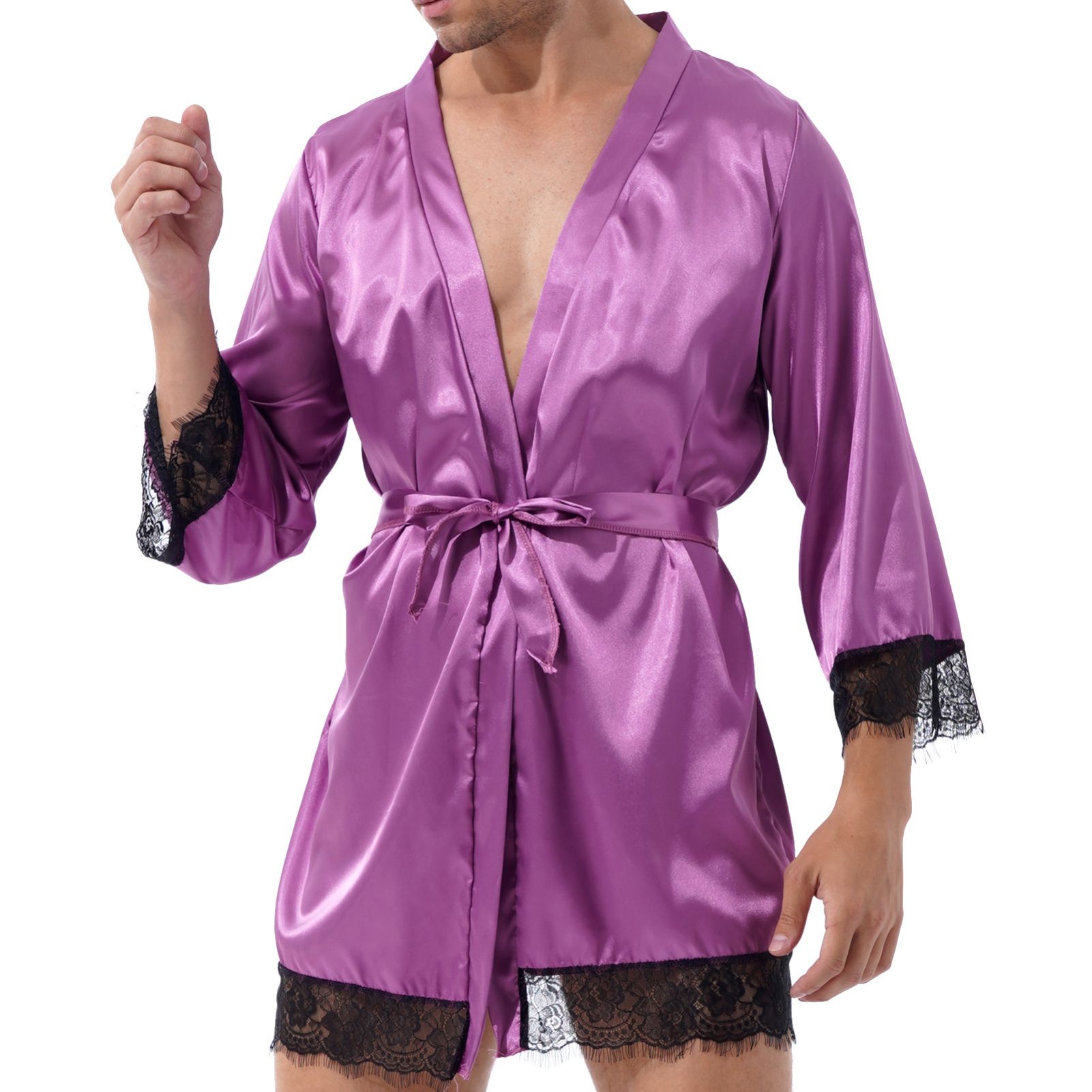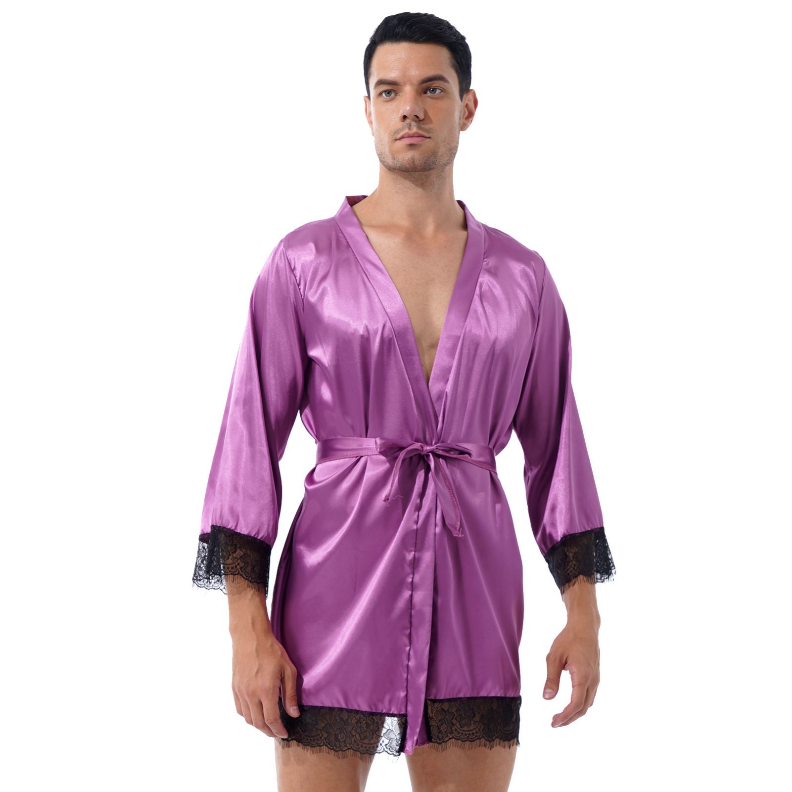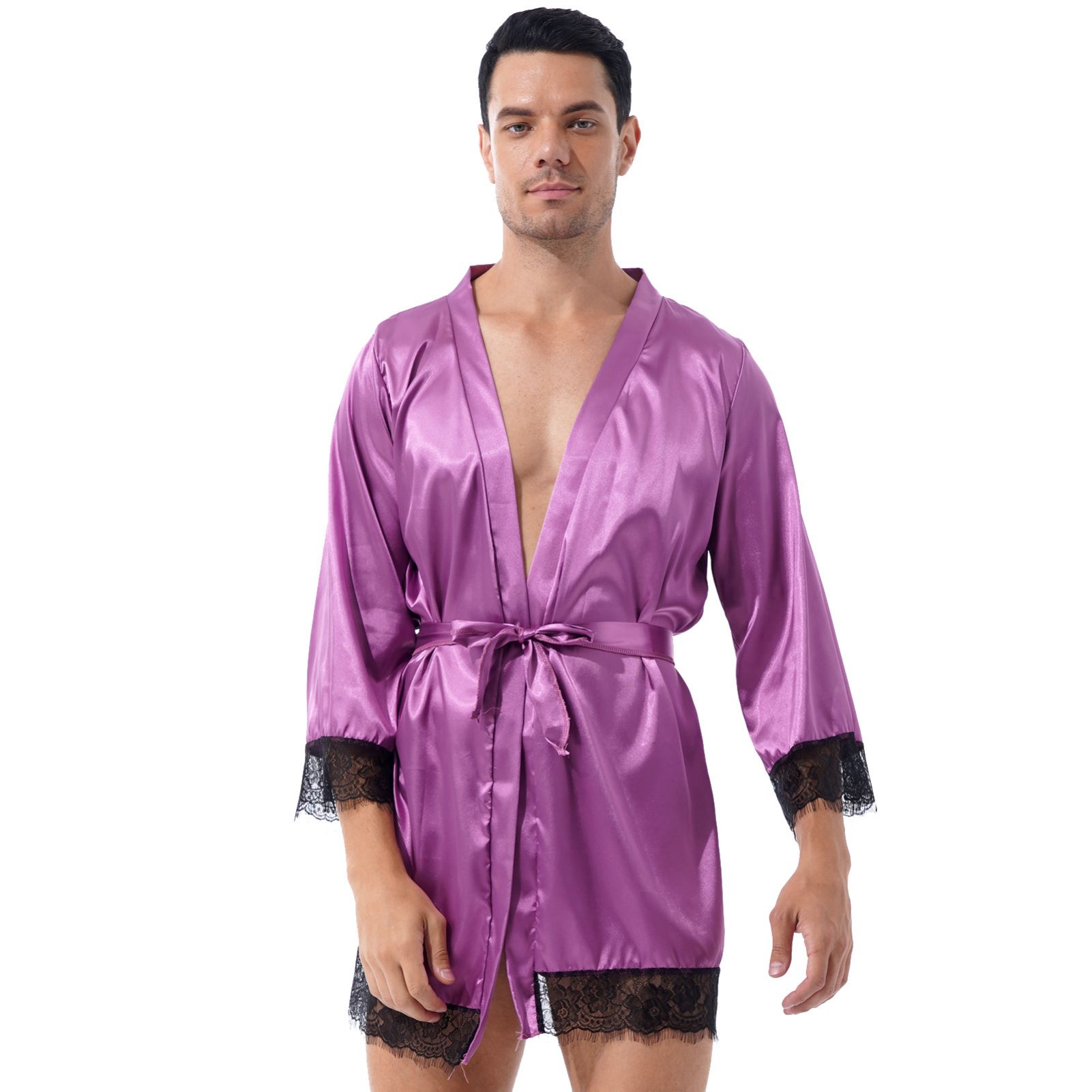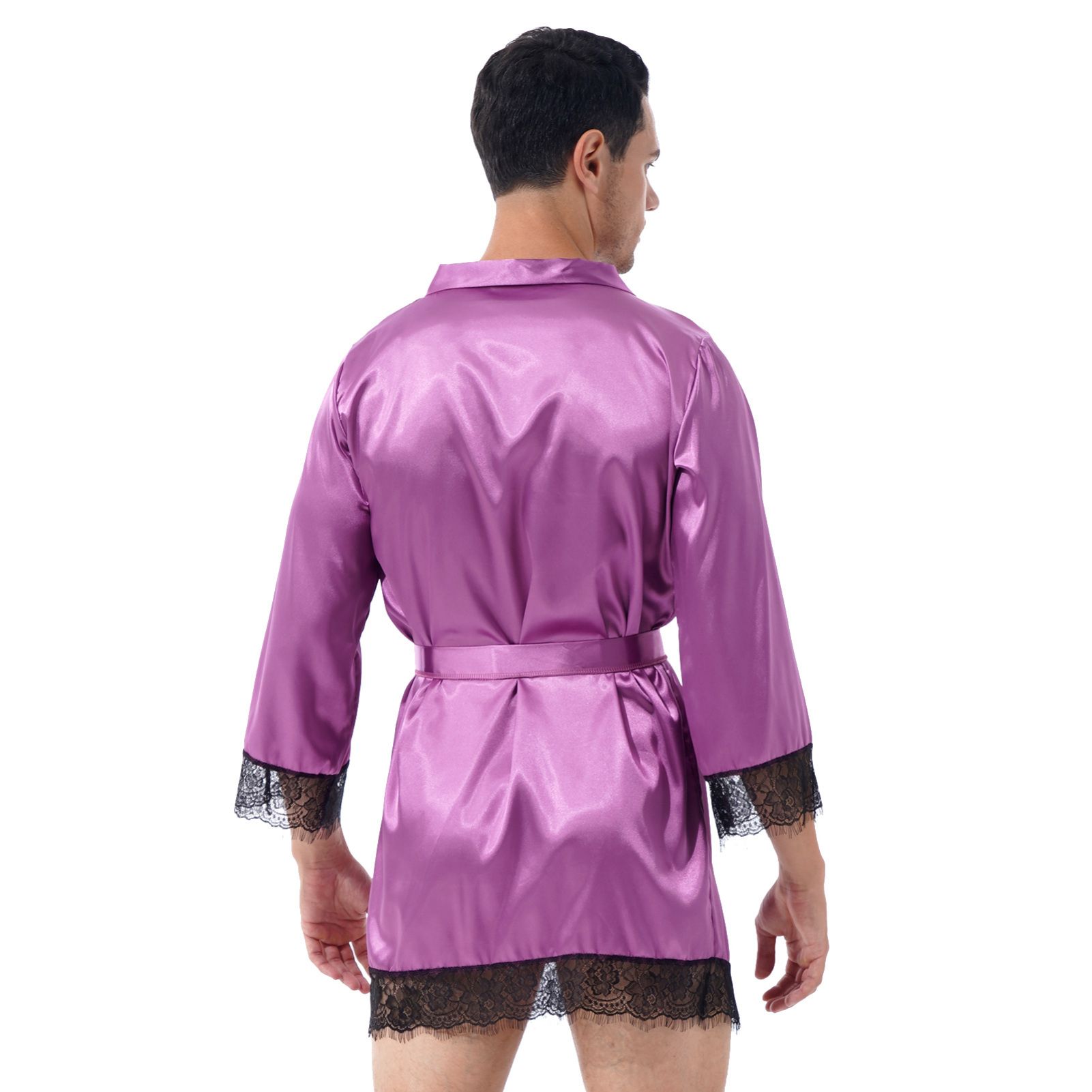 iEFiEL Mens Sissy Long Sleeve Satin Open Front Bathrobe Sleepwear Lace Trim Belted Kimono Night-robe