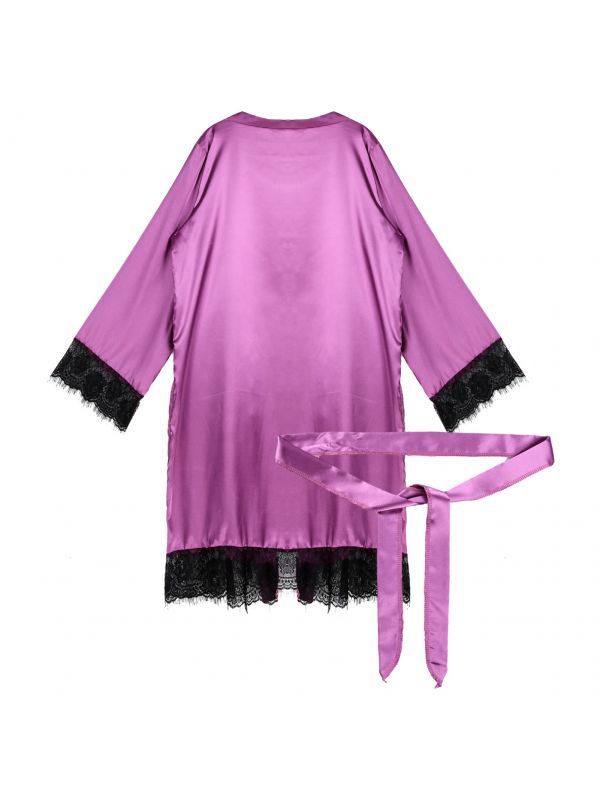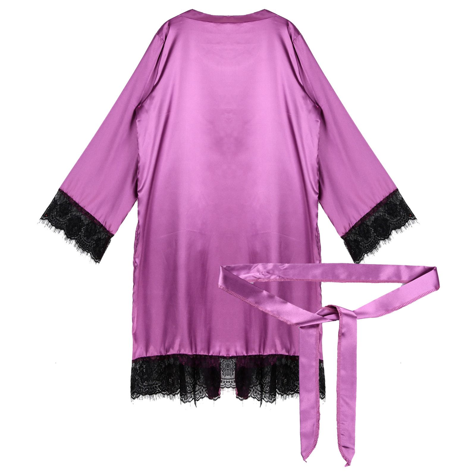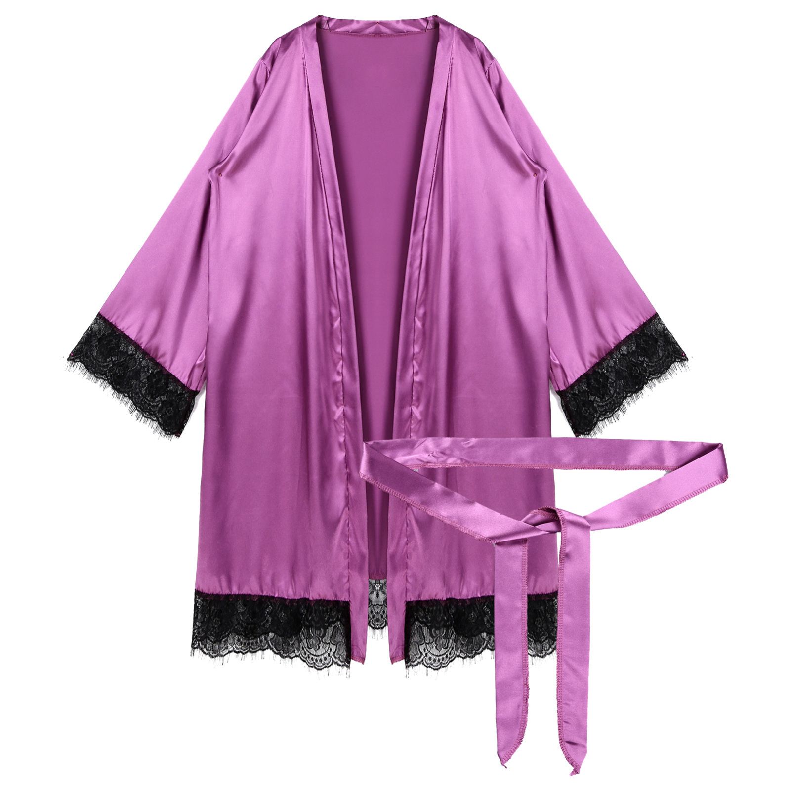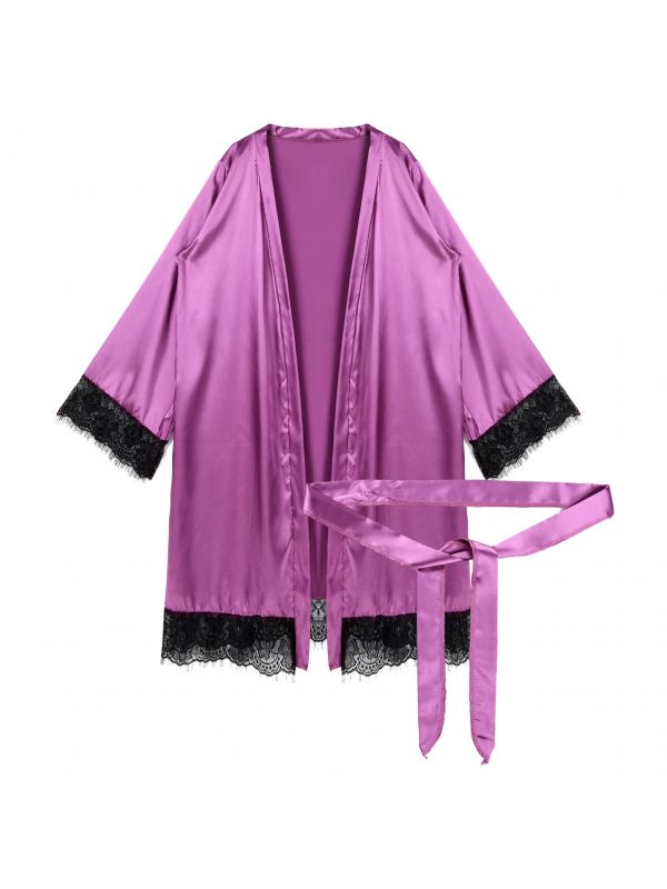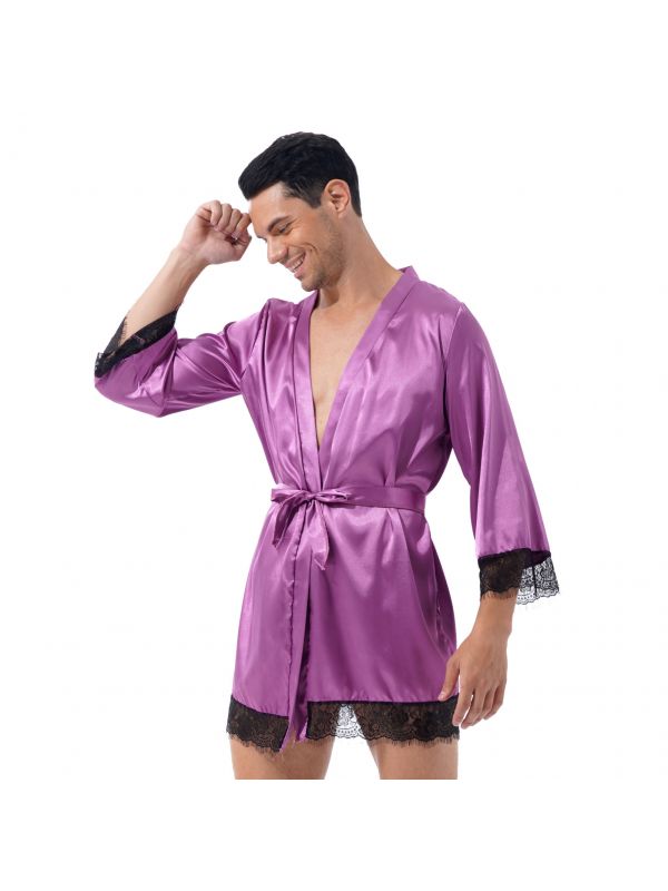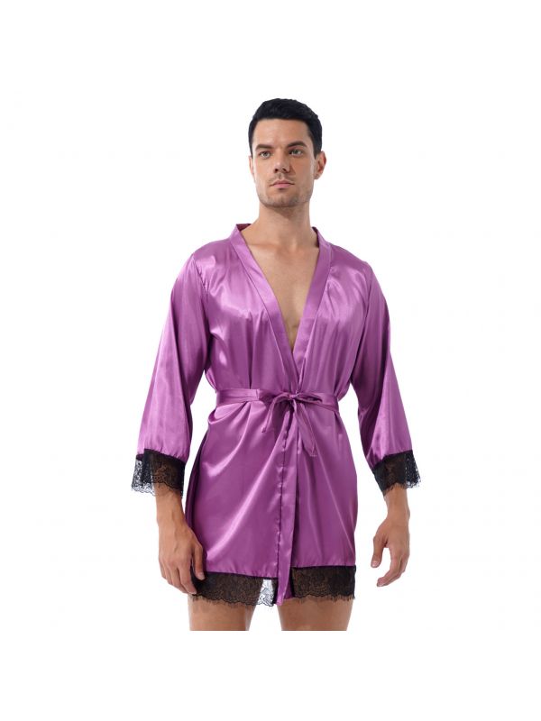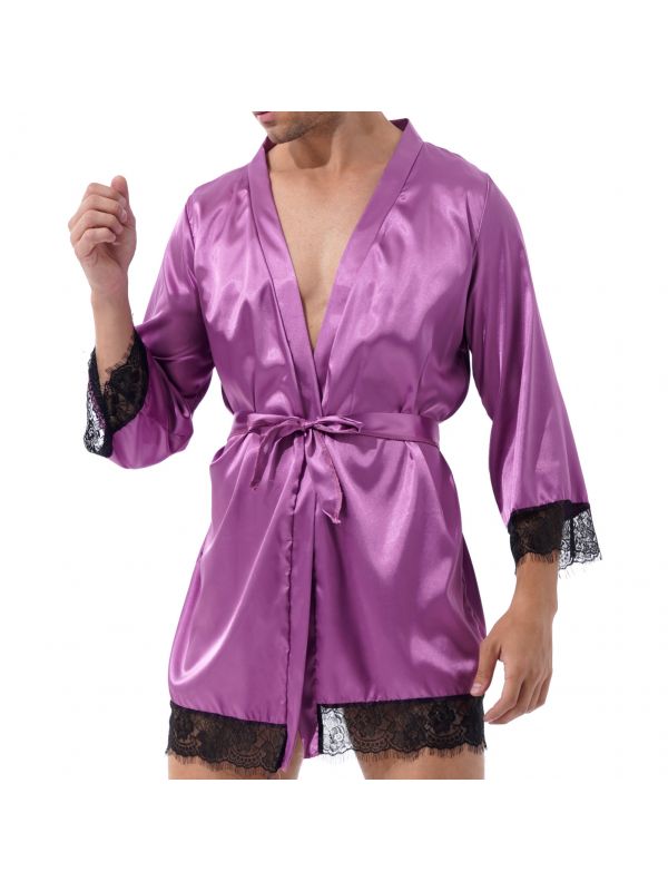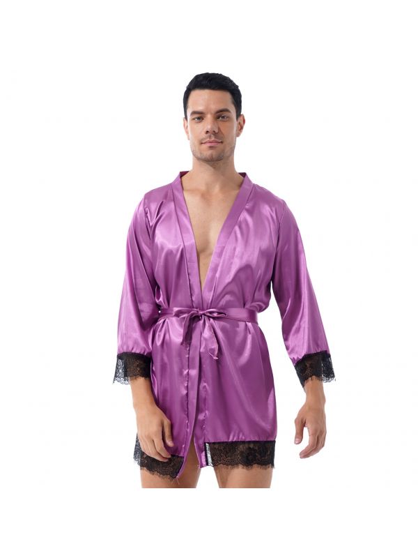 iEFiEL Mens Sissy Long Sleeve Satin Open Front Bathrobe Sleepwear Lace Trim Belted Kimono Night-robe