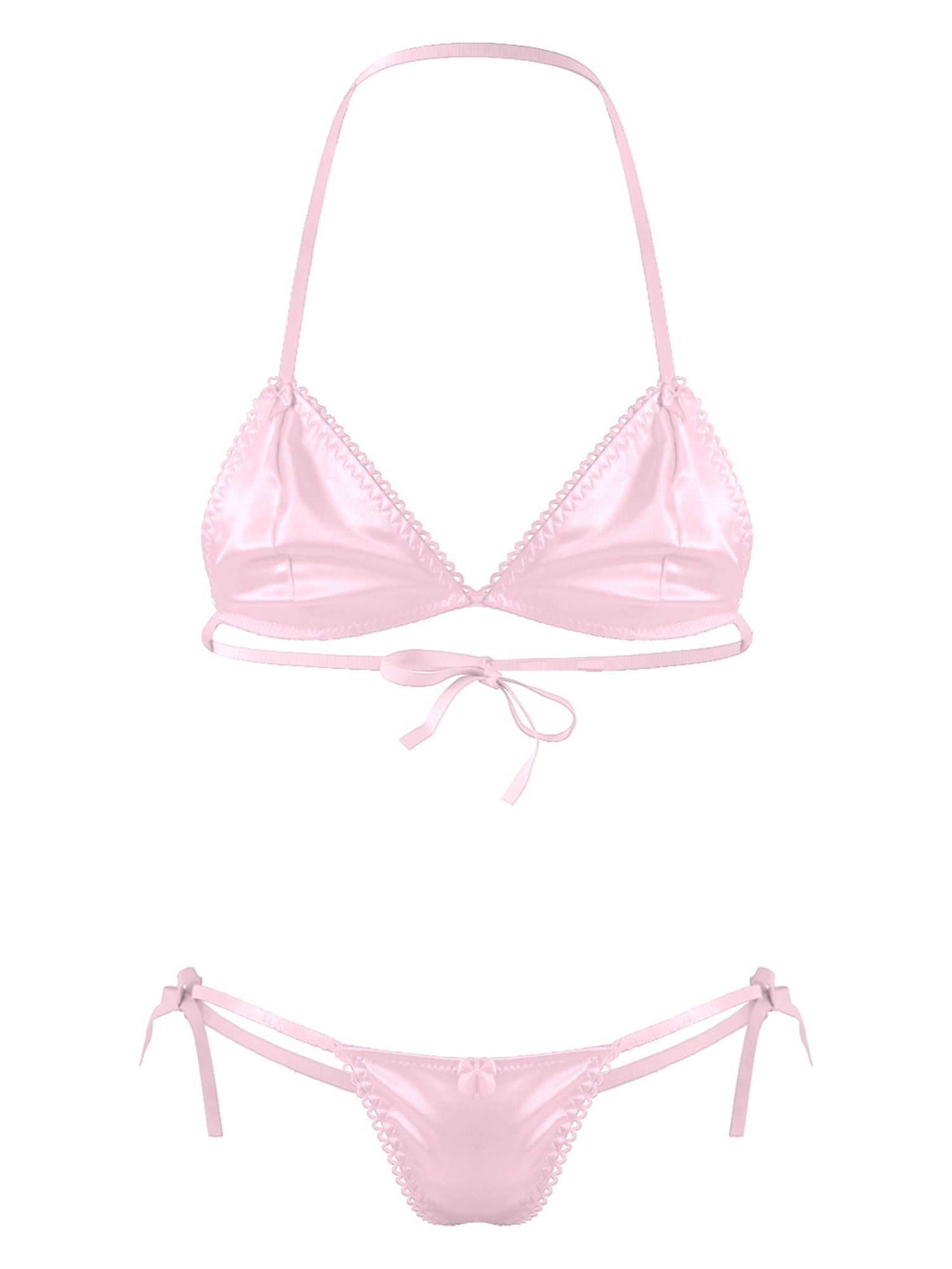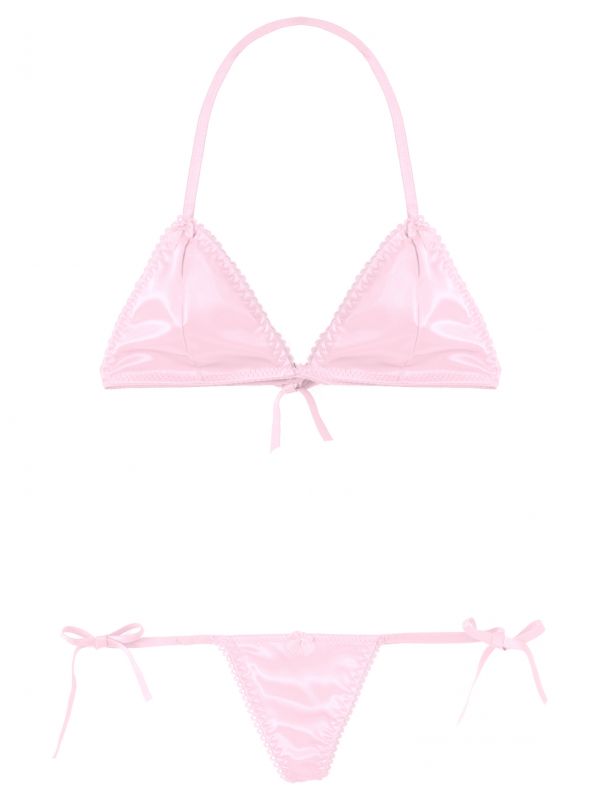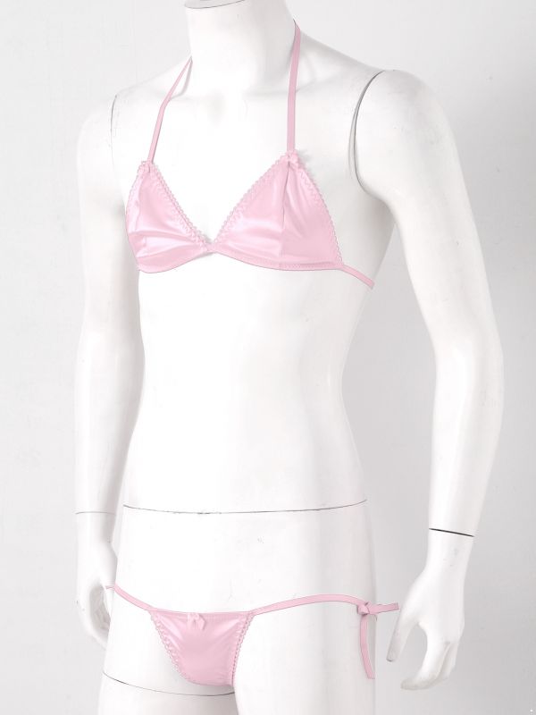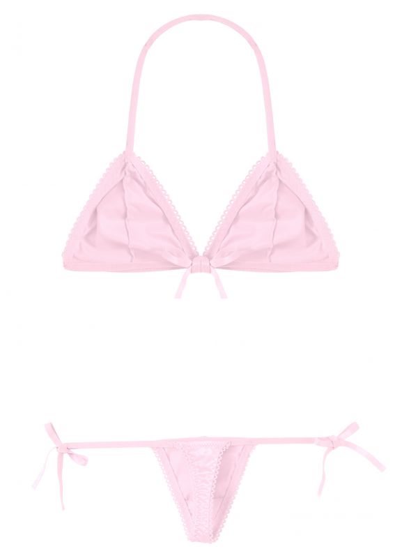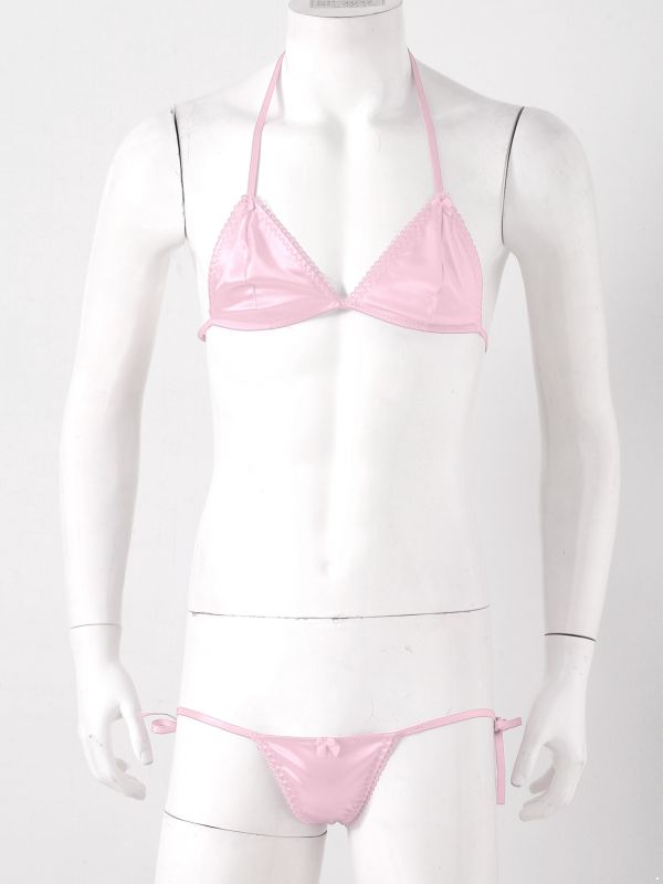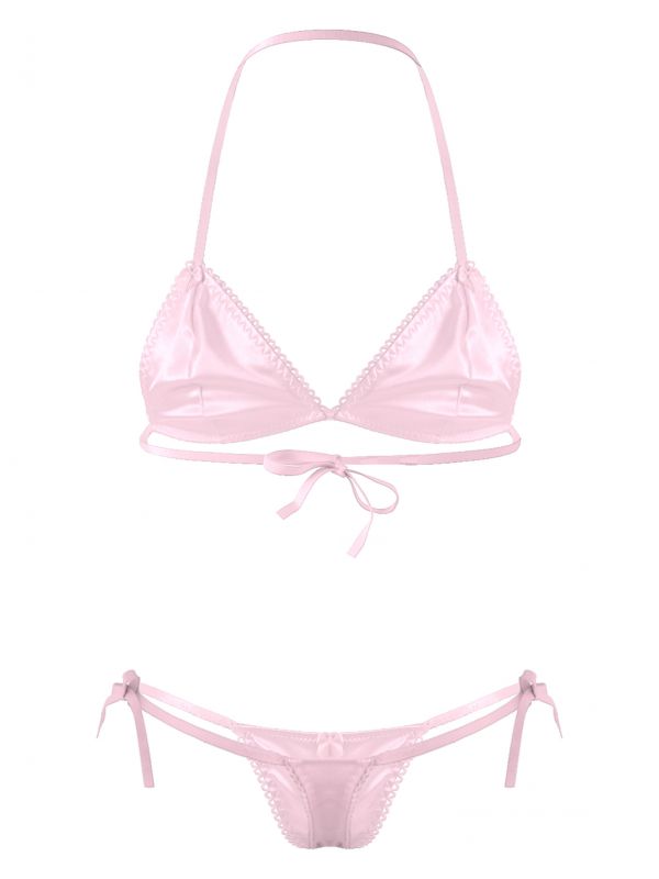 Men Sissy 2pcs Satin Lace-up Wireless Bra and T-back Thongs Lingerie Set