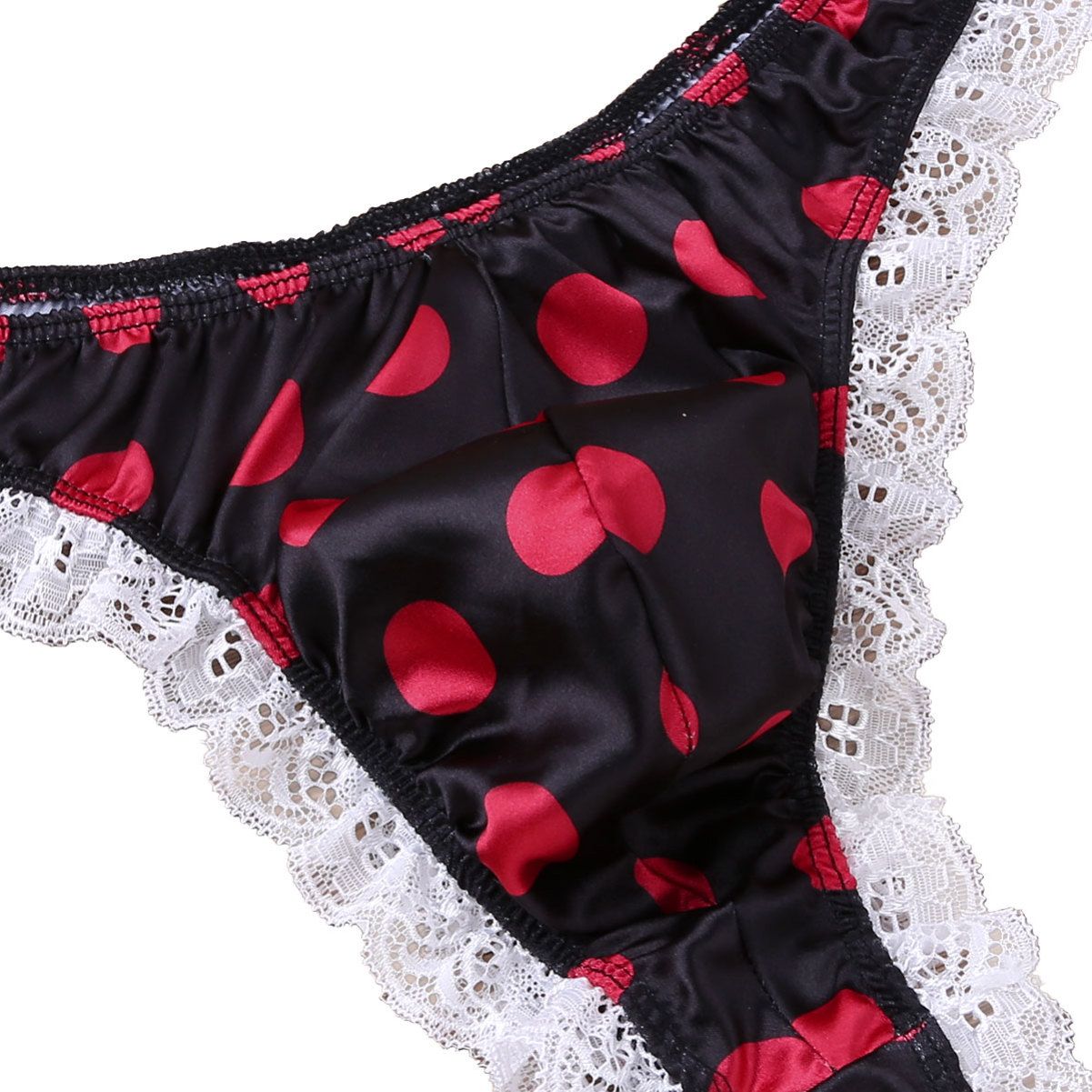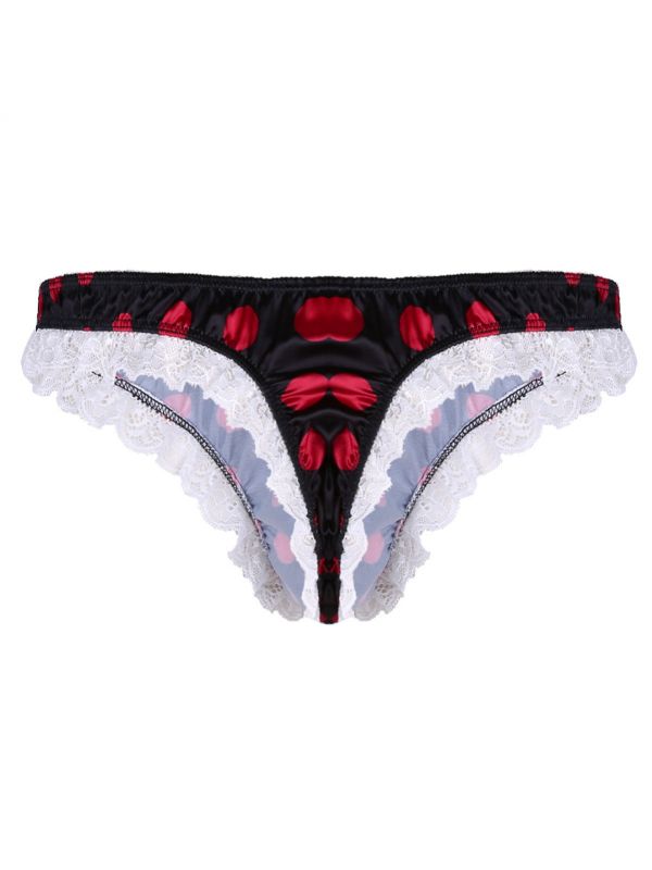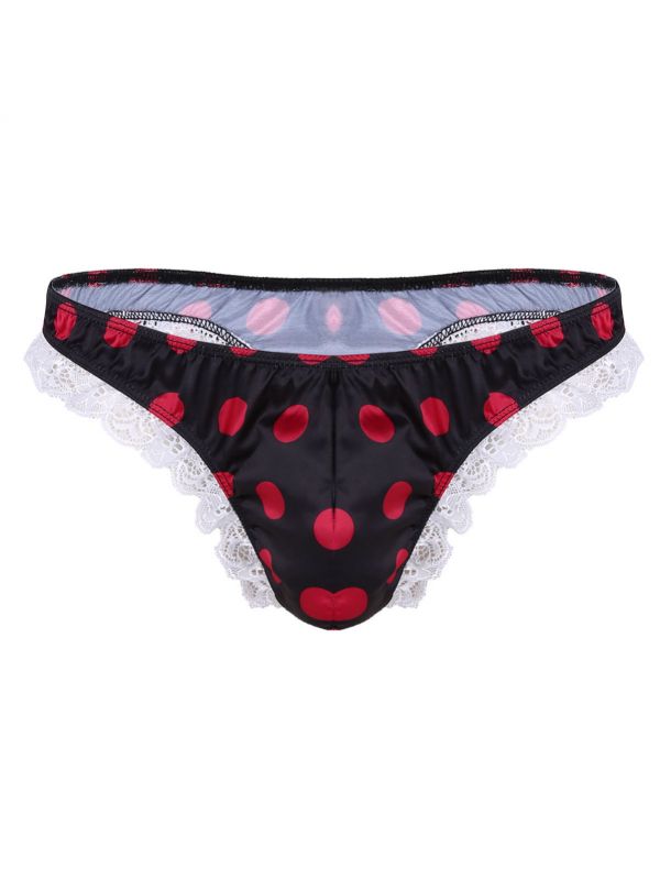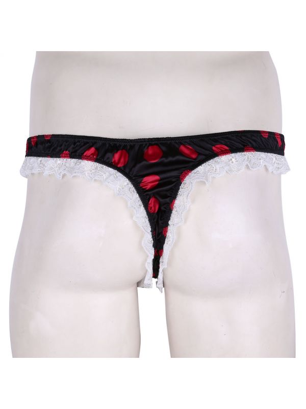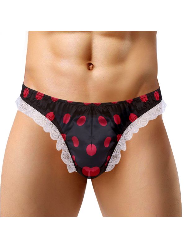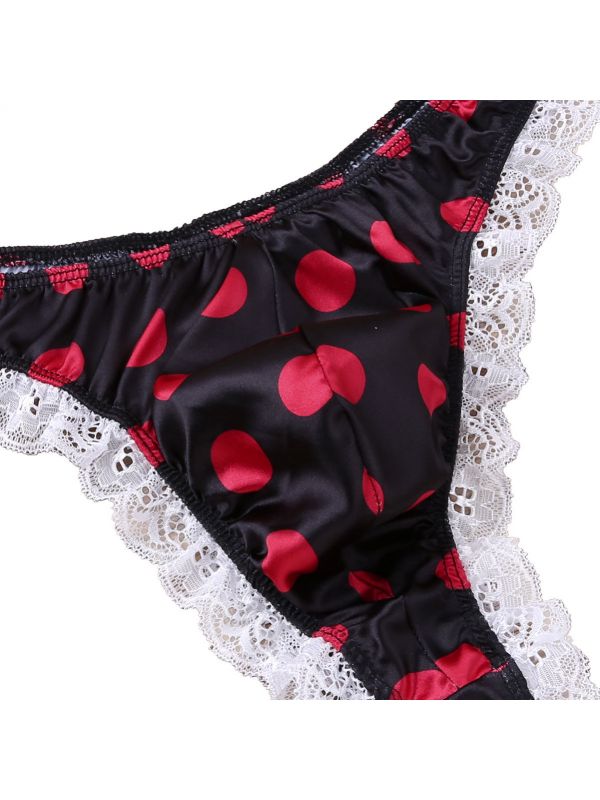 Men Sissy Satin Low Rise Ruffle Lace Polka Dots Bikini G-string