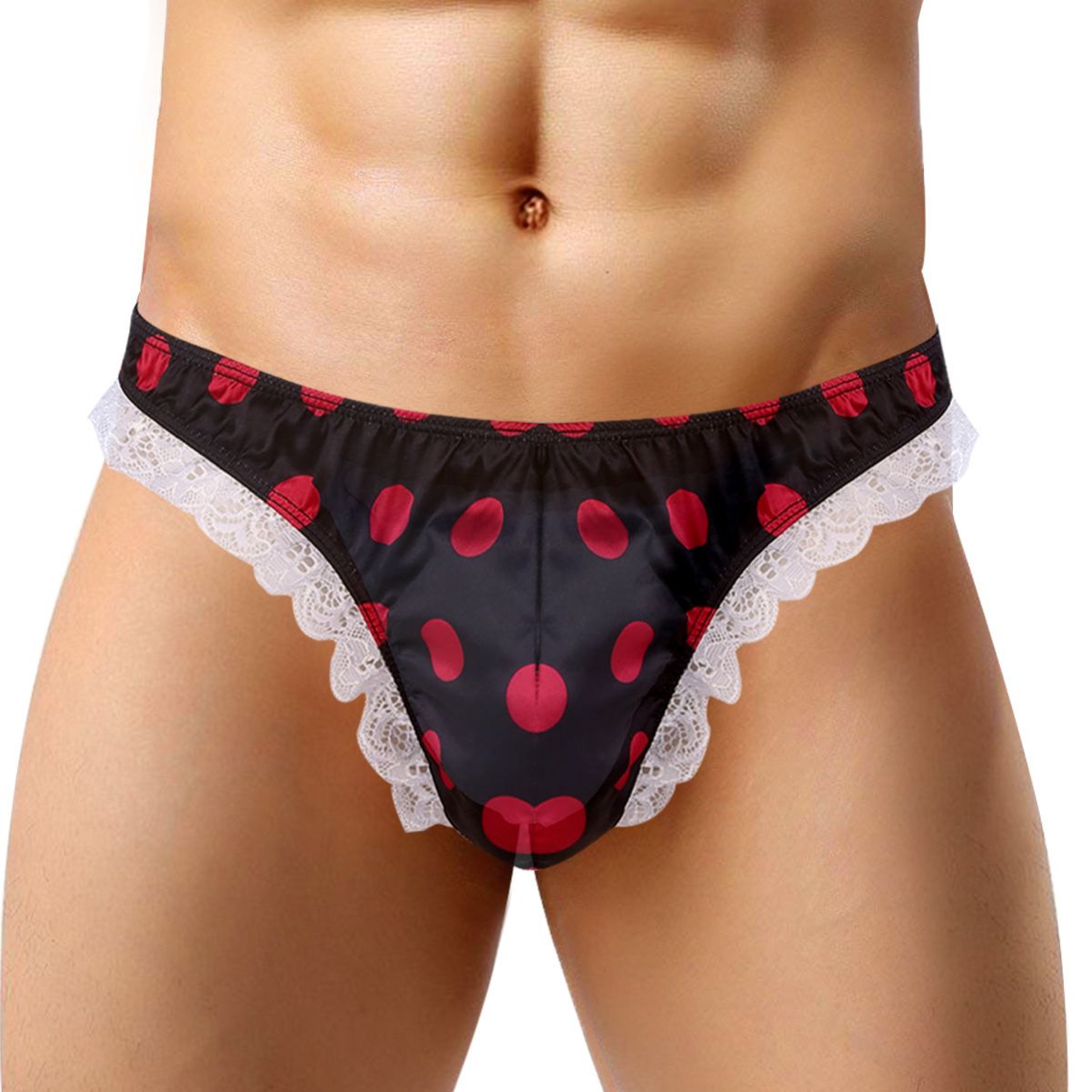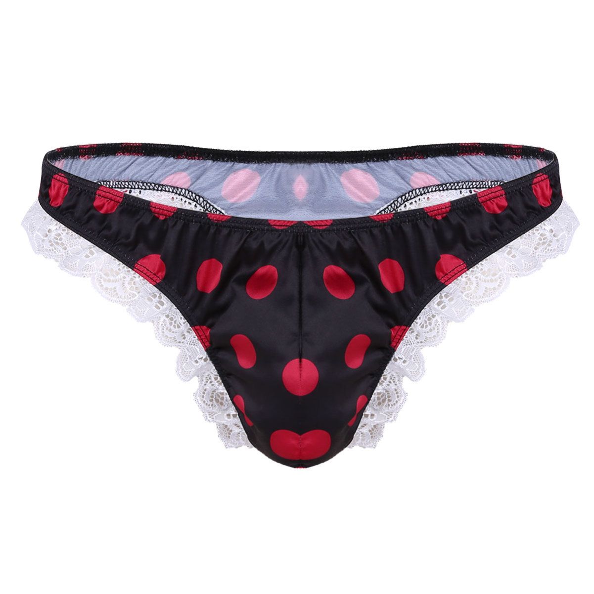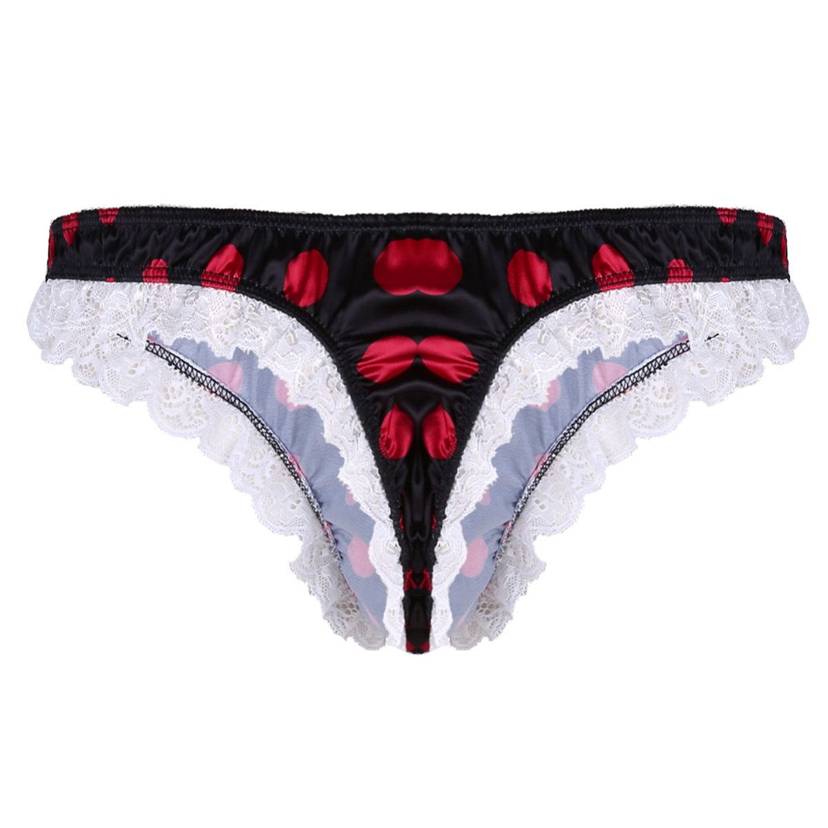 Men Sissy Satin Low Rise Ruffle Lace Polka Dots Bikini G-string