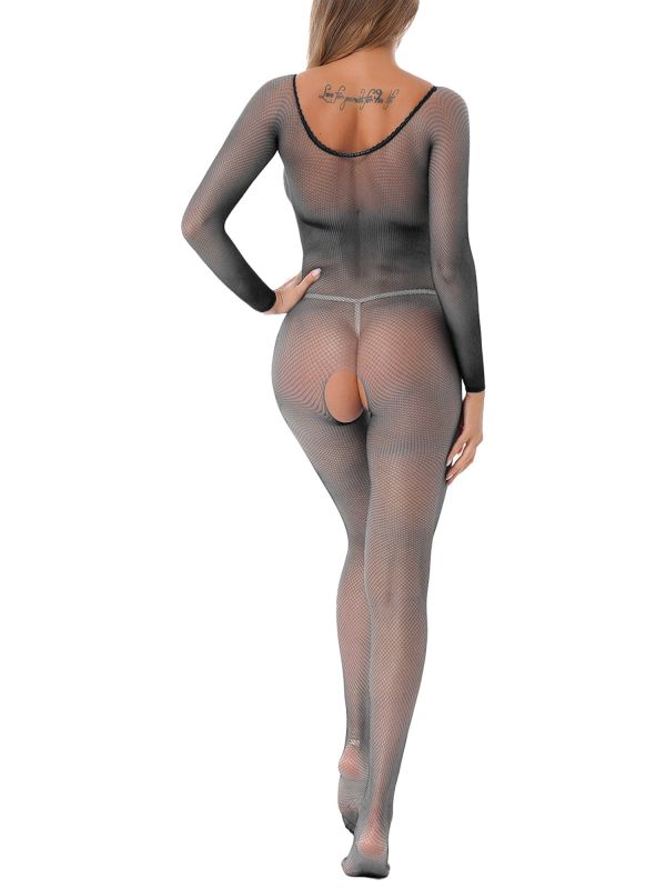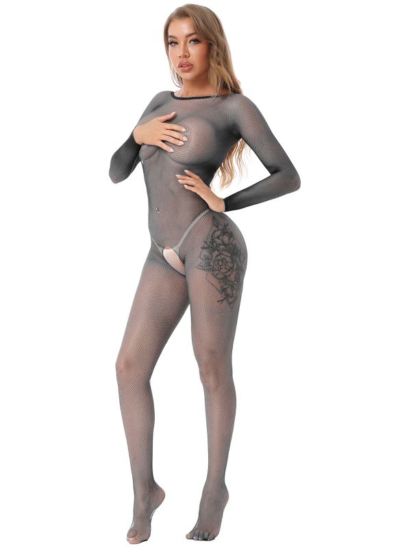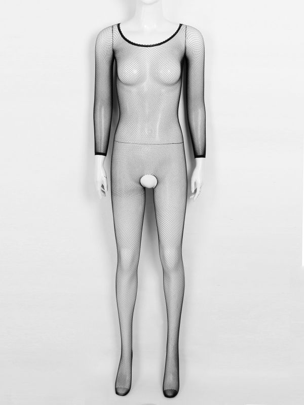 Womens See-through Crotchless Body Stockings Round Neck Bodysuit Long Sleeve Leotard Nightwear.