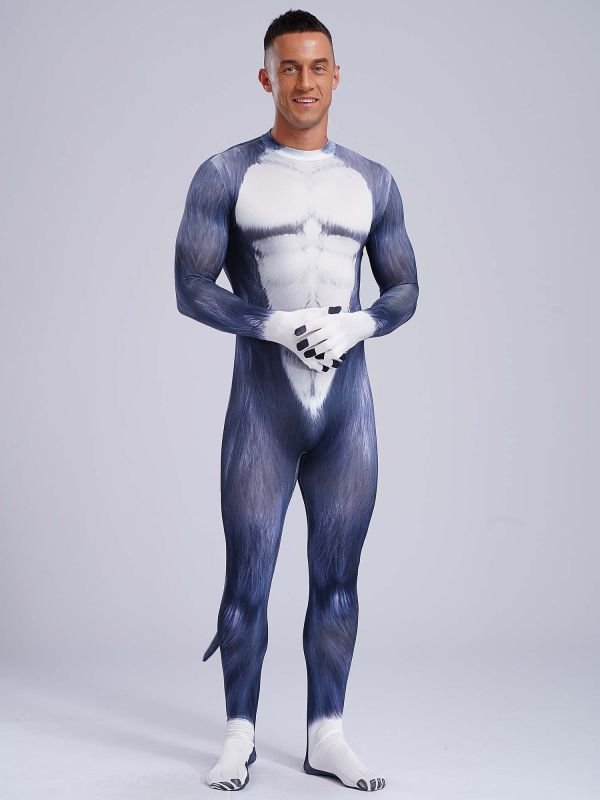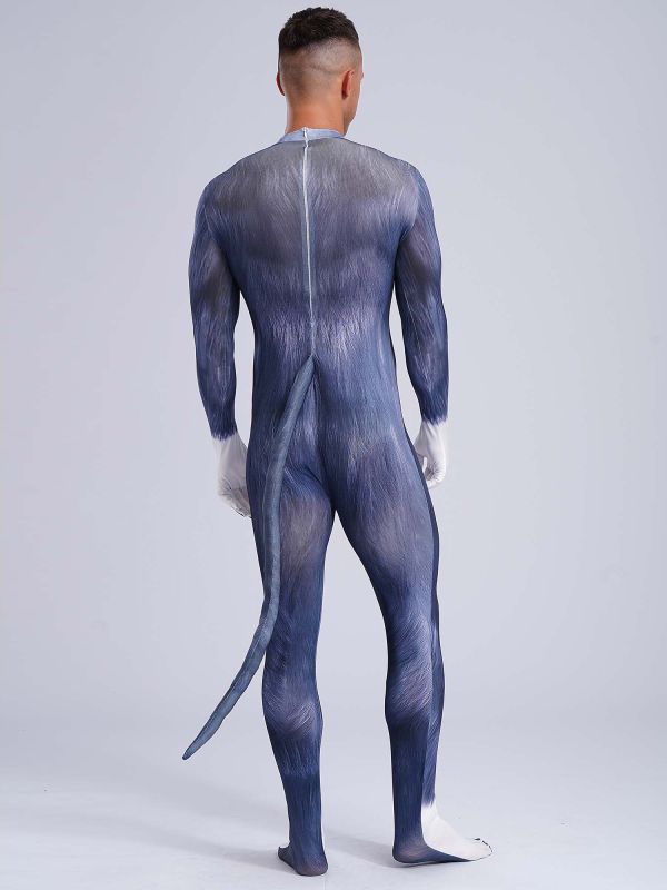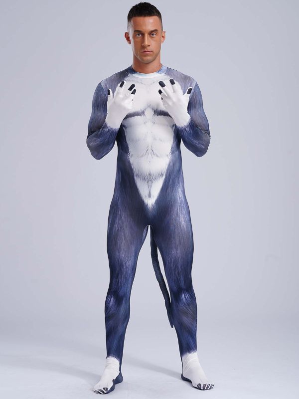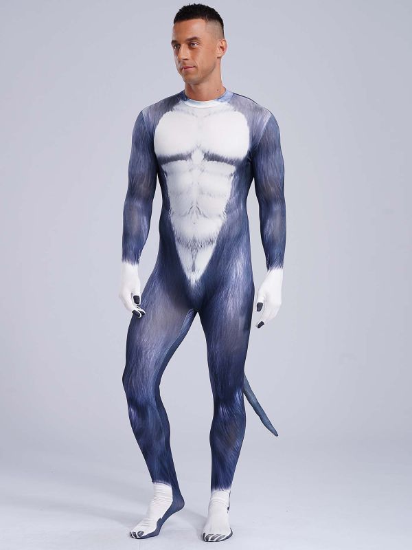 Men Animal 3D Printed Full-body Tail Footed Jumpsuit Zentai for Halloween