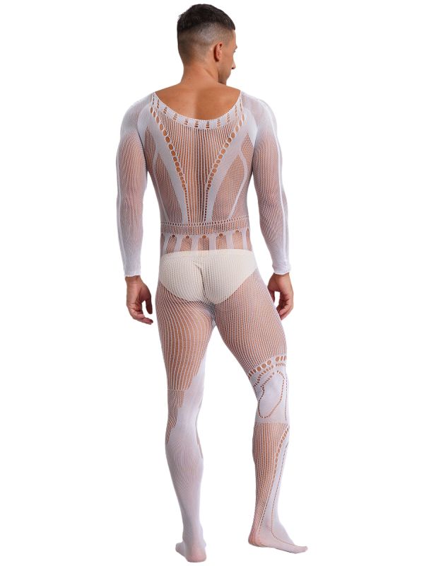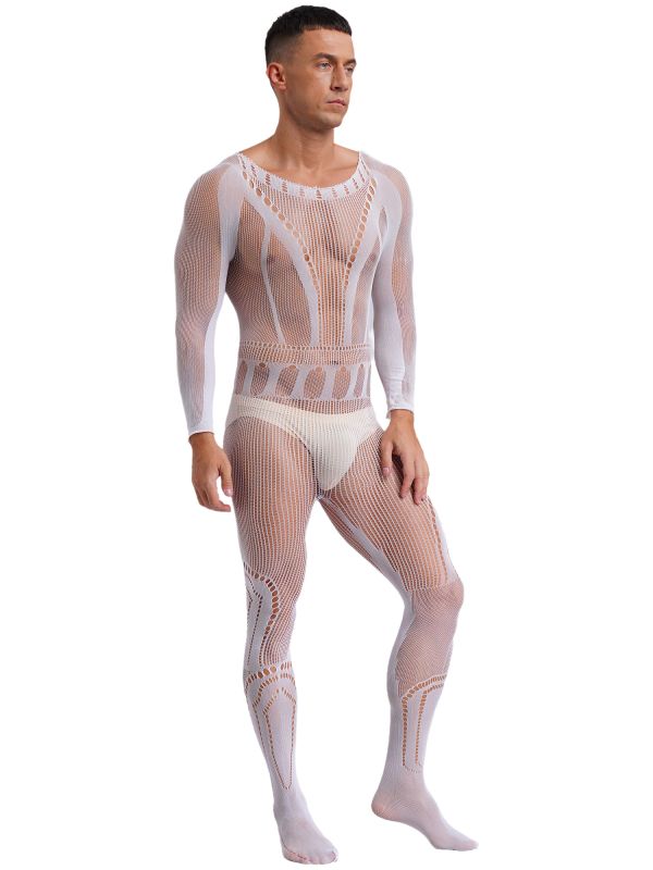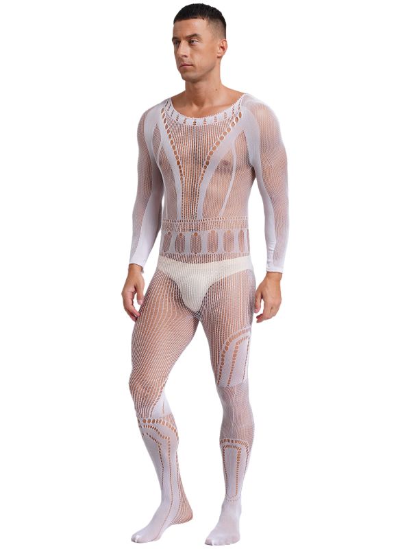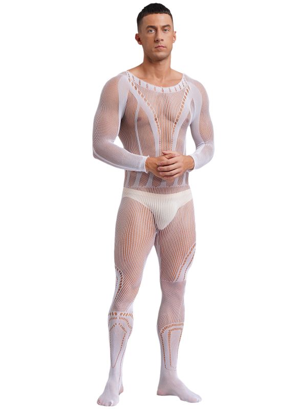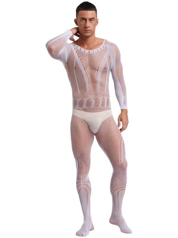 Men Sissy Long Sleeve See-through Fishnet Bodystocking Jumpsuit