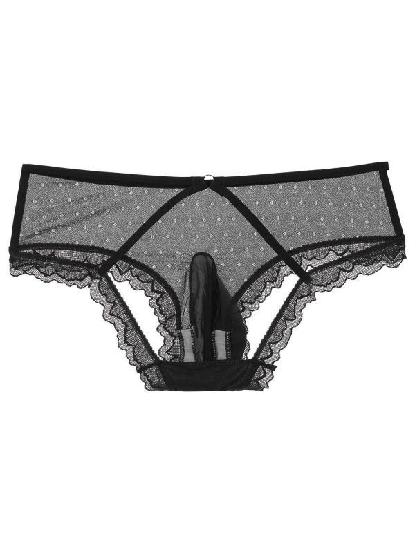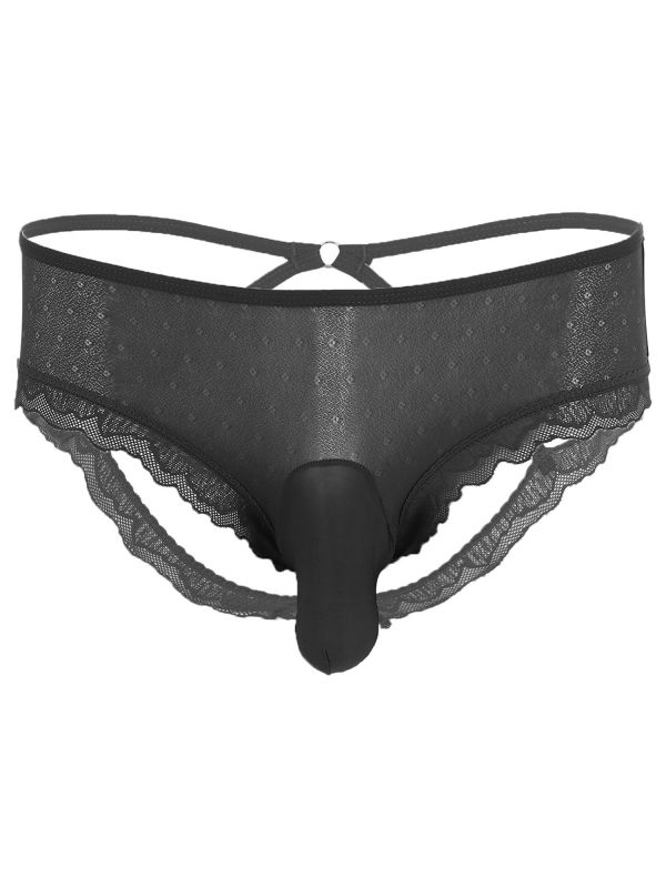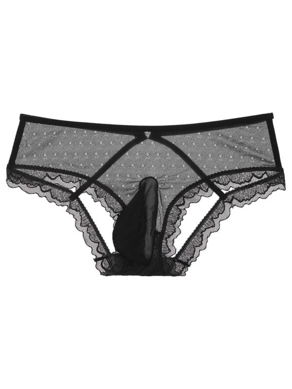 Low rise briefs for men, lace trim, semi see-through design, open butt with 2 straps to make you look more attractive to your lover.