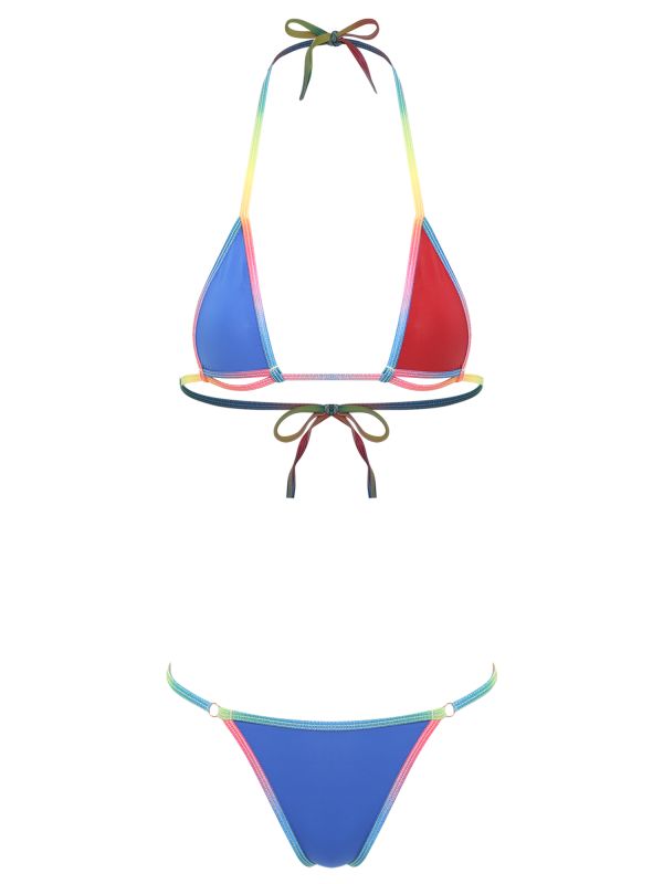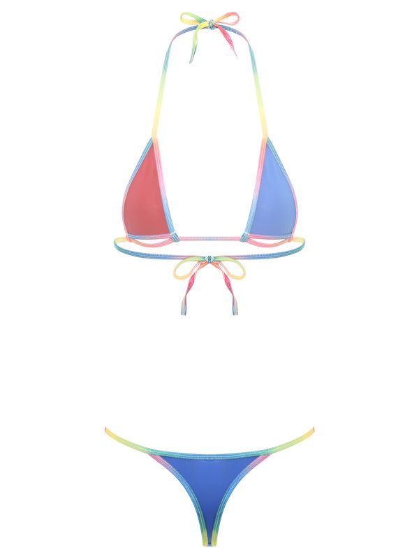 Women 2pcs Backless Colorful Rainbow Straps Self-Tie Micro Bikini Set
