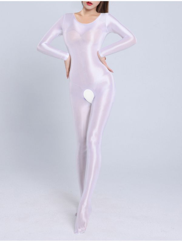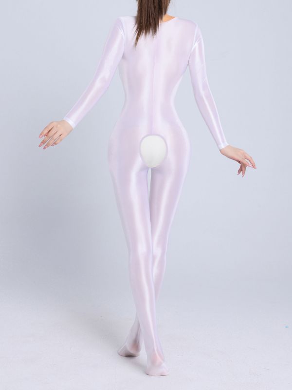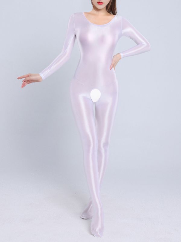 Women Glossy Long Sleeve Smooth Open Crotch Jumpsuit