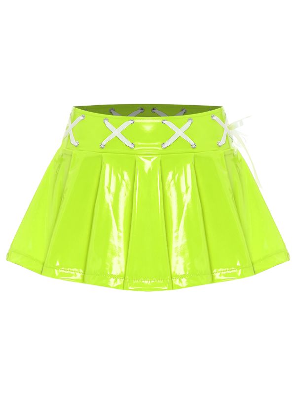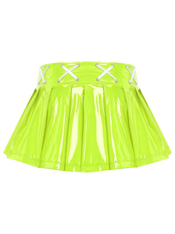 Women Wet Look Patent Leather Lace-up Pleated Miniskirt