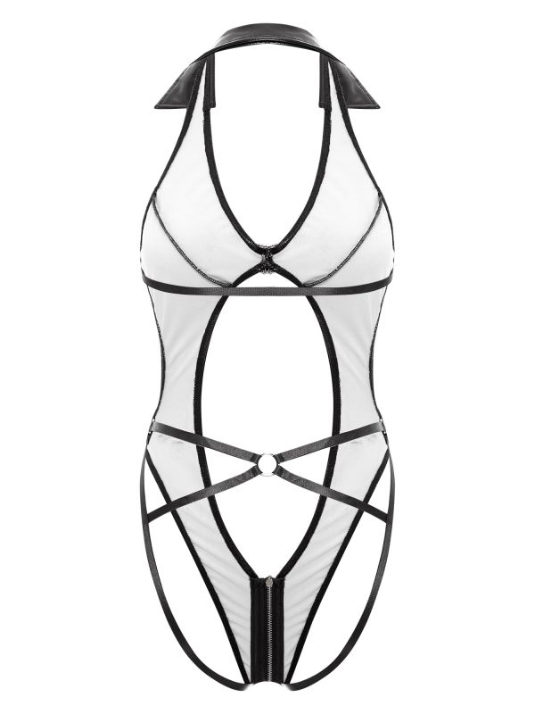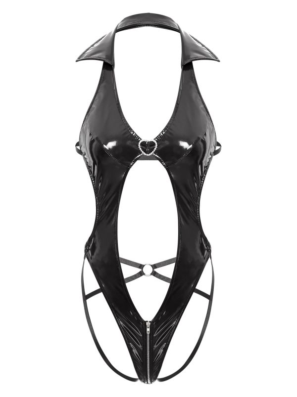 Women Patent Leather Bodysuit Deep V Neck Butt Flaunting Hollow Latex Catsuit