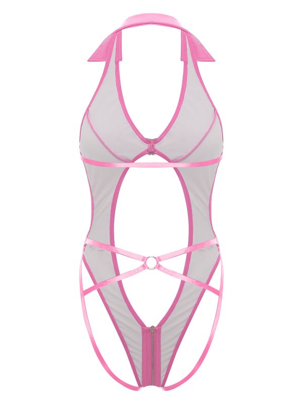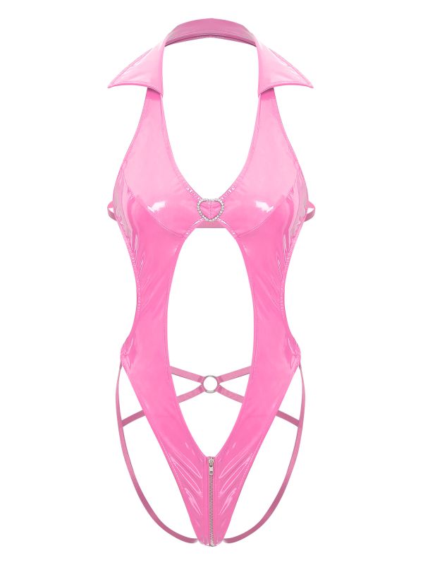 Women Patent Leather Bodysuit Deep V Neck Butt Flaunting Hollow Latex Catsuit