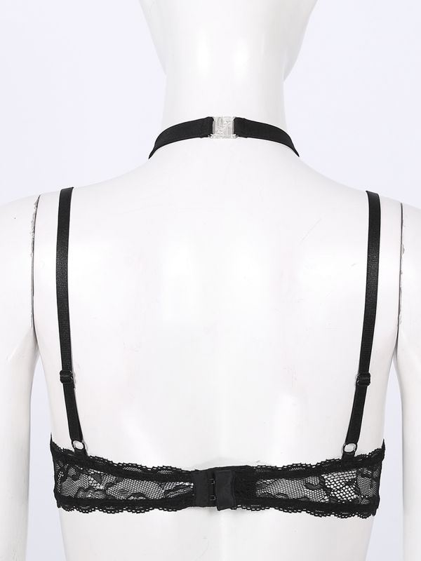 Women's Lace Floral Portrait Open Tip Bra Halterneck Unlined Push-up Bralette
