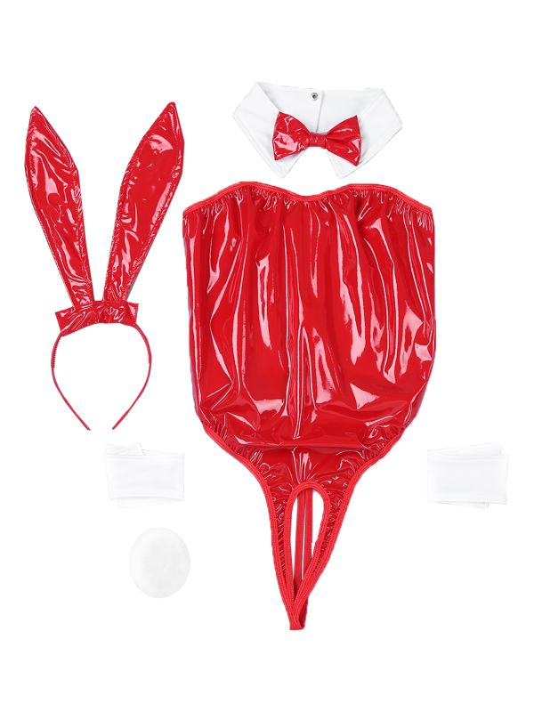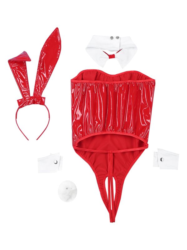 Strapless patent leather bodysuit, high cut design will visually prolong your legs, open crotch make you look more attractive to your lover.