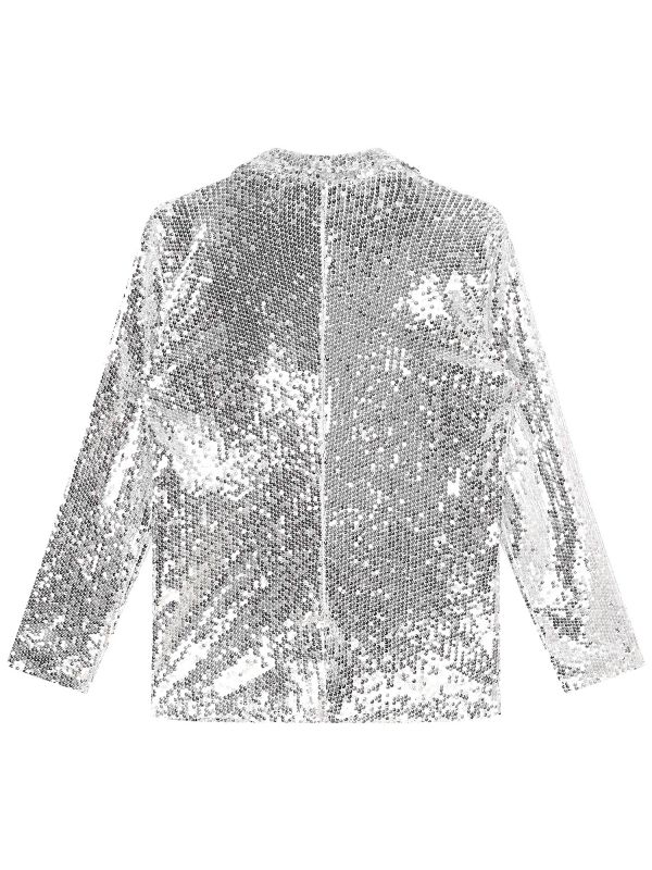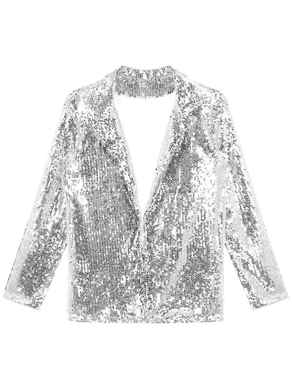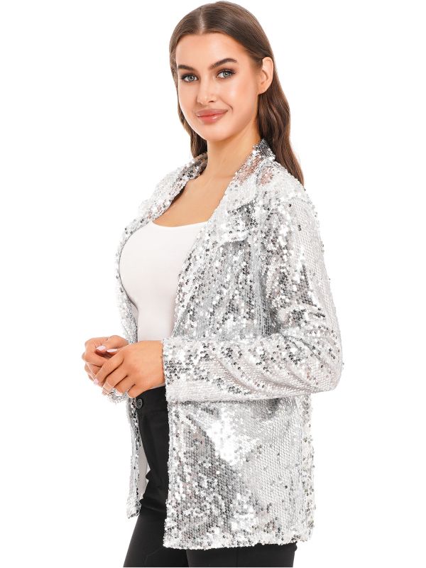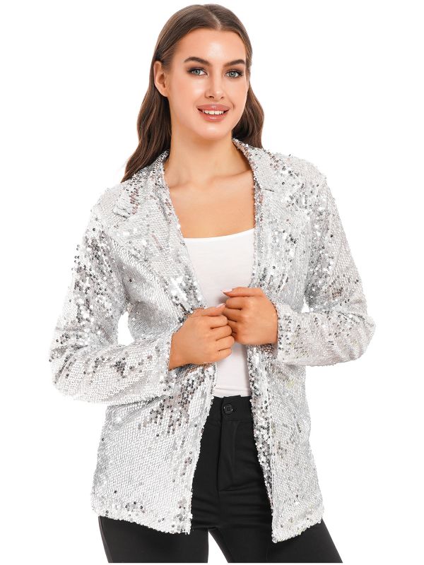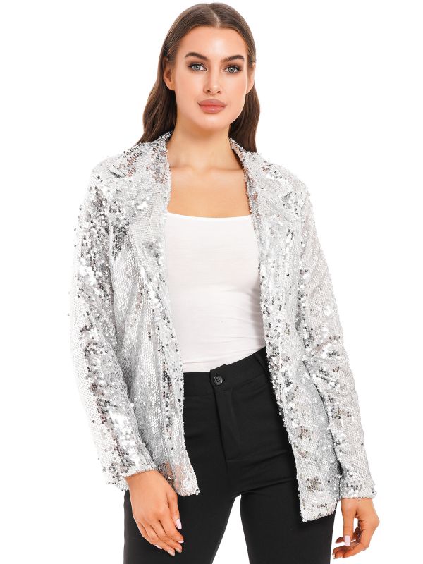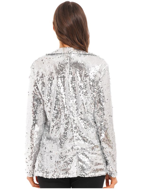 Women's Sparkly Sequin Long Sleeve Notch Lapel Open Front Blazer Jacket Nightclub Party Cardigan Outwear