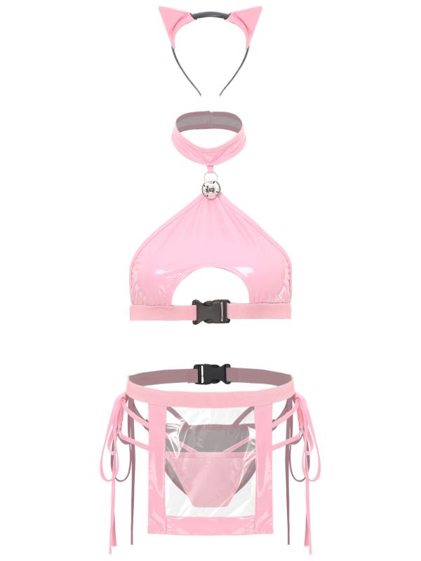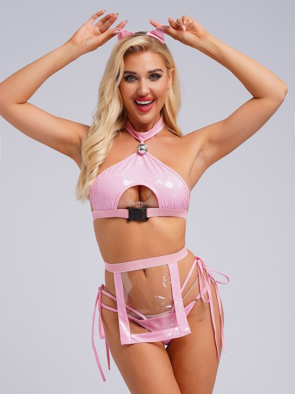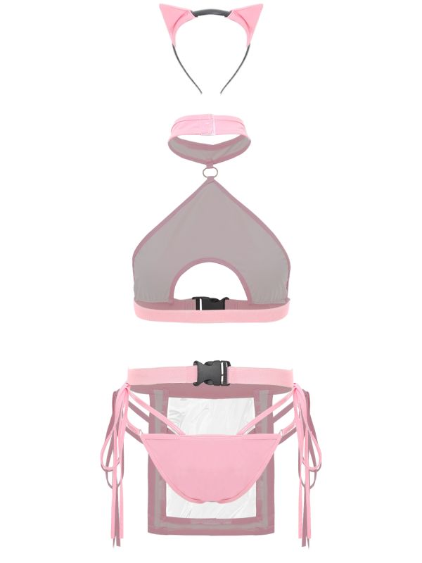 Women Sexy 4pcs Wetlook Crop Top and Briefs with Apron Bunny Girl Set