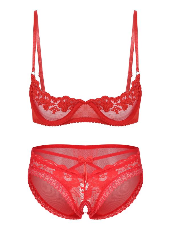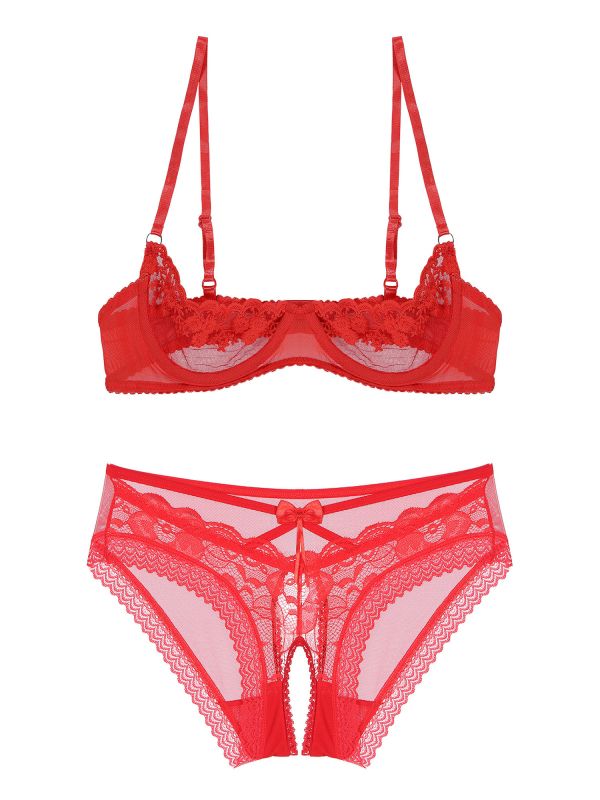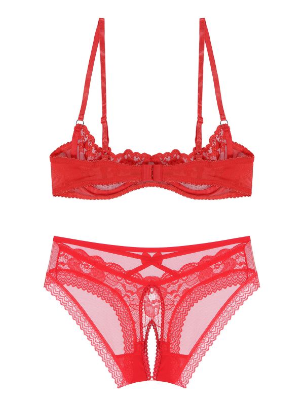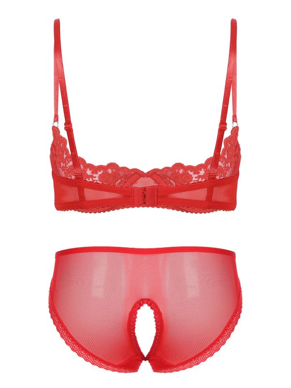 Women 2pcs Lace Cupless Bra with Crotchless Briefs Lingerie Set