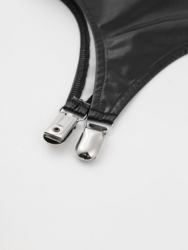 Designed with metal clips to hold the stockings. Patent leather brings wet look, glossy luster, enhancing your charms.